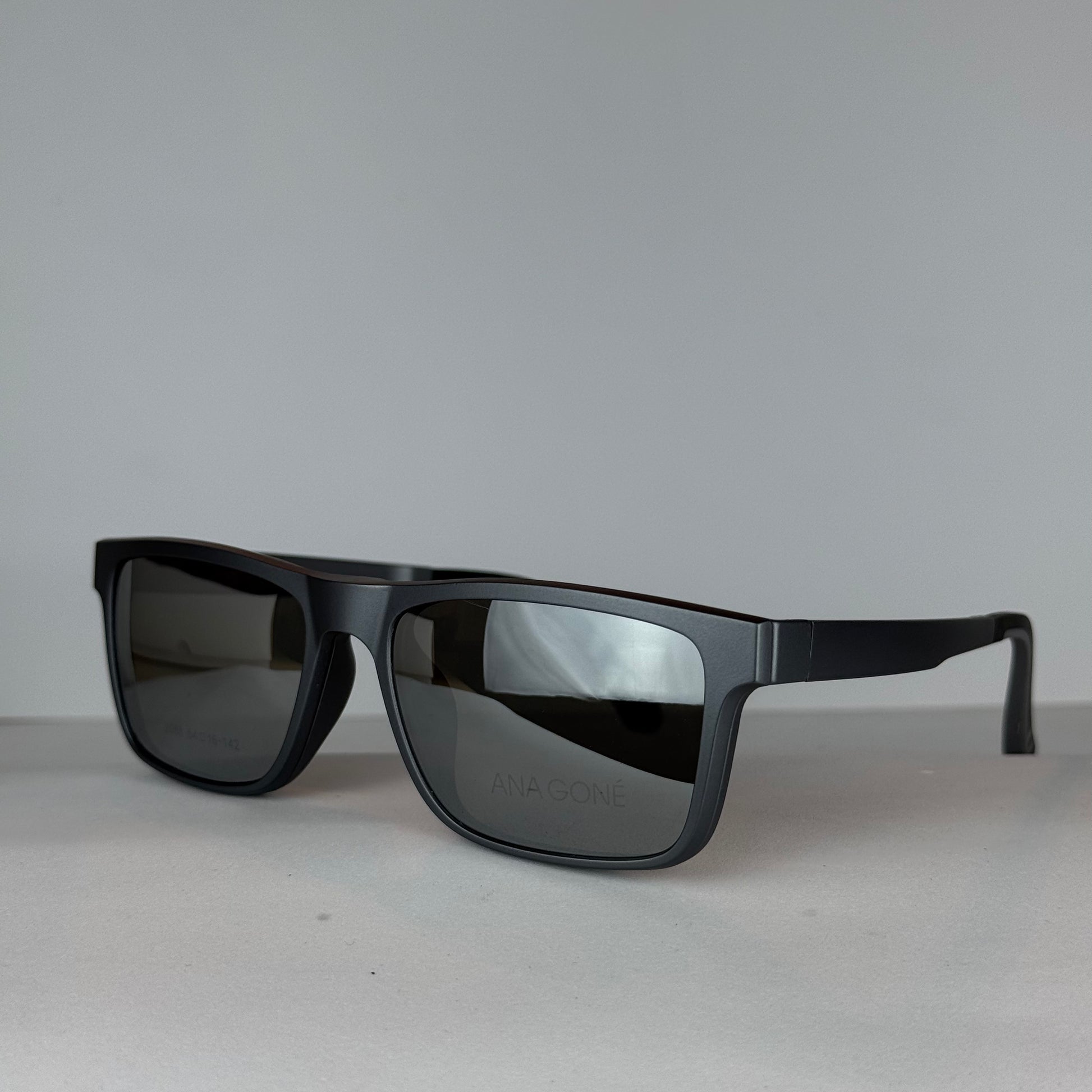 DESCRIPCIÓN: Diseño rectangular que favorece rostros redondos u ovalados aportando estructura y equilibrio. El gris plomo sólido mate transmite sobriedad y modernidad. El clip polarizado gris mantiene estética uniforme y funcional para el día a día.