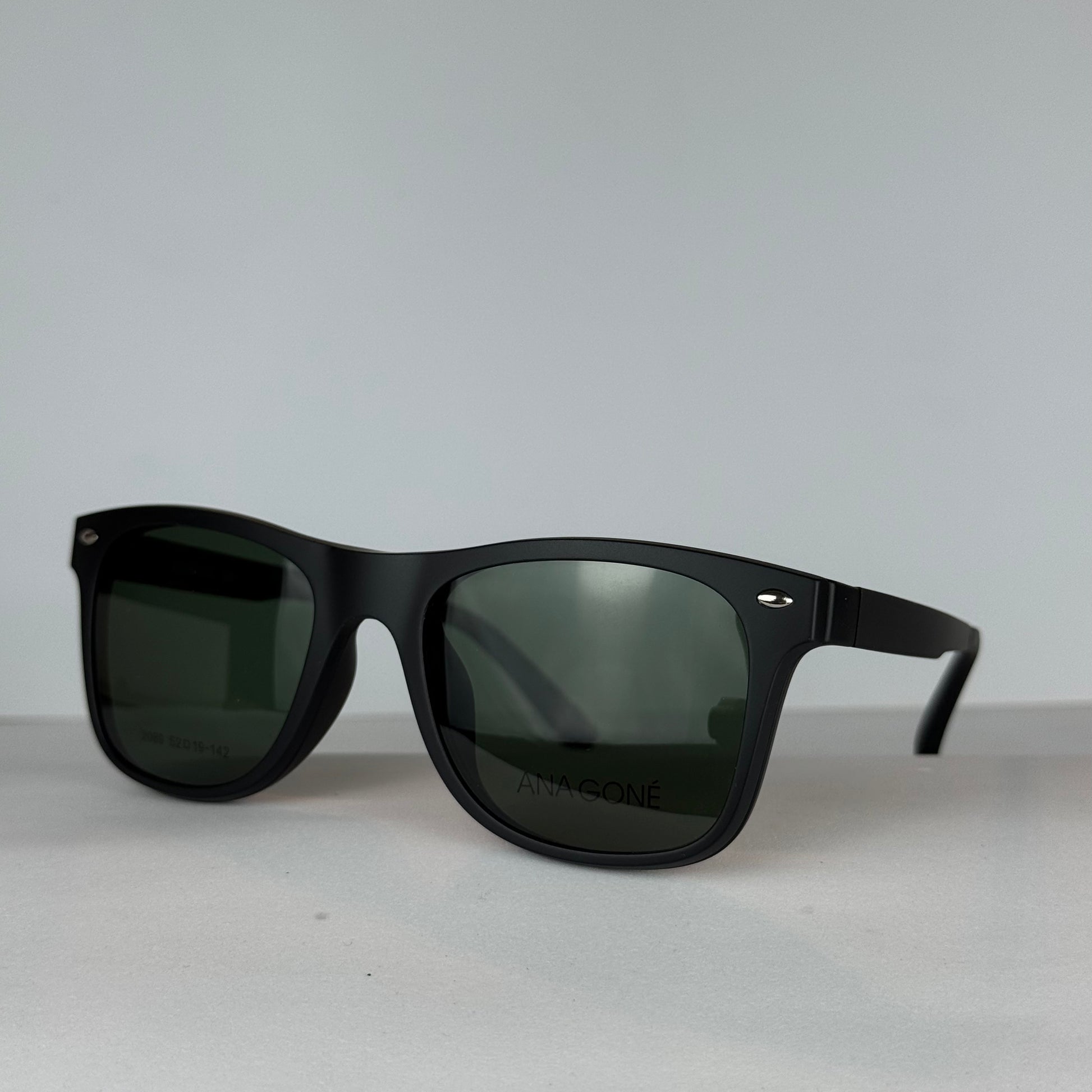 DESCRIPCIÓN: Diseño rectangular suavizado que favorece rostros redondos u ovalados, aportando definición sin endurecer. El negro sólido mate en pasta ofrece un estilo moderno y sobrio. El clip polarizado G15 en verde suma protección y un acabado clásico y funcional.