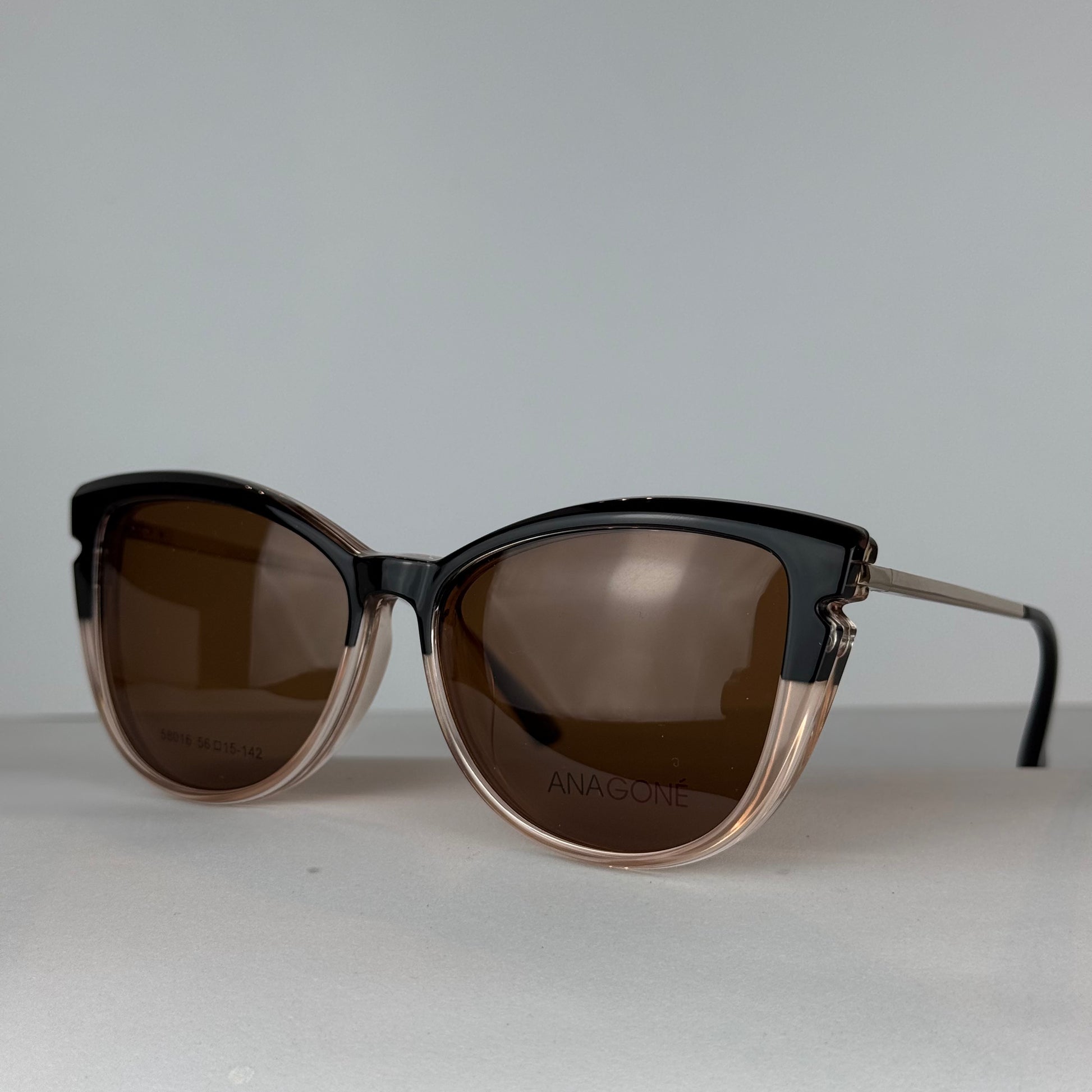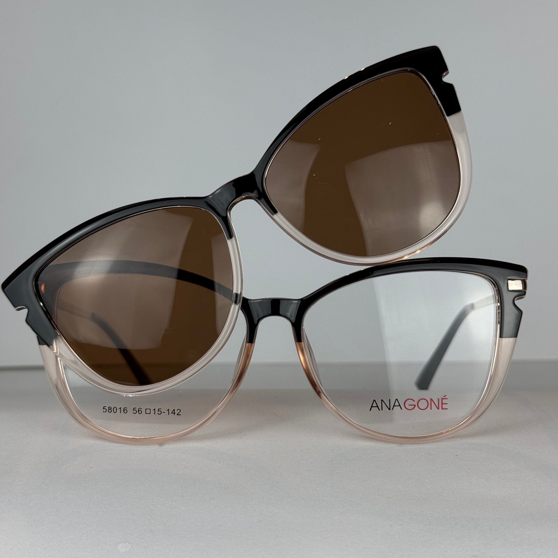 CARACTERÍSTICAS:Aro frente en pasta, color negro sólido desvanecido a durazno translúcido, brillante, diseño cat eye redondeado suavizado. Patillas en metal dorado.Clip es igual en cuanto a acabados, lente polarizado en color café.