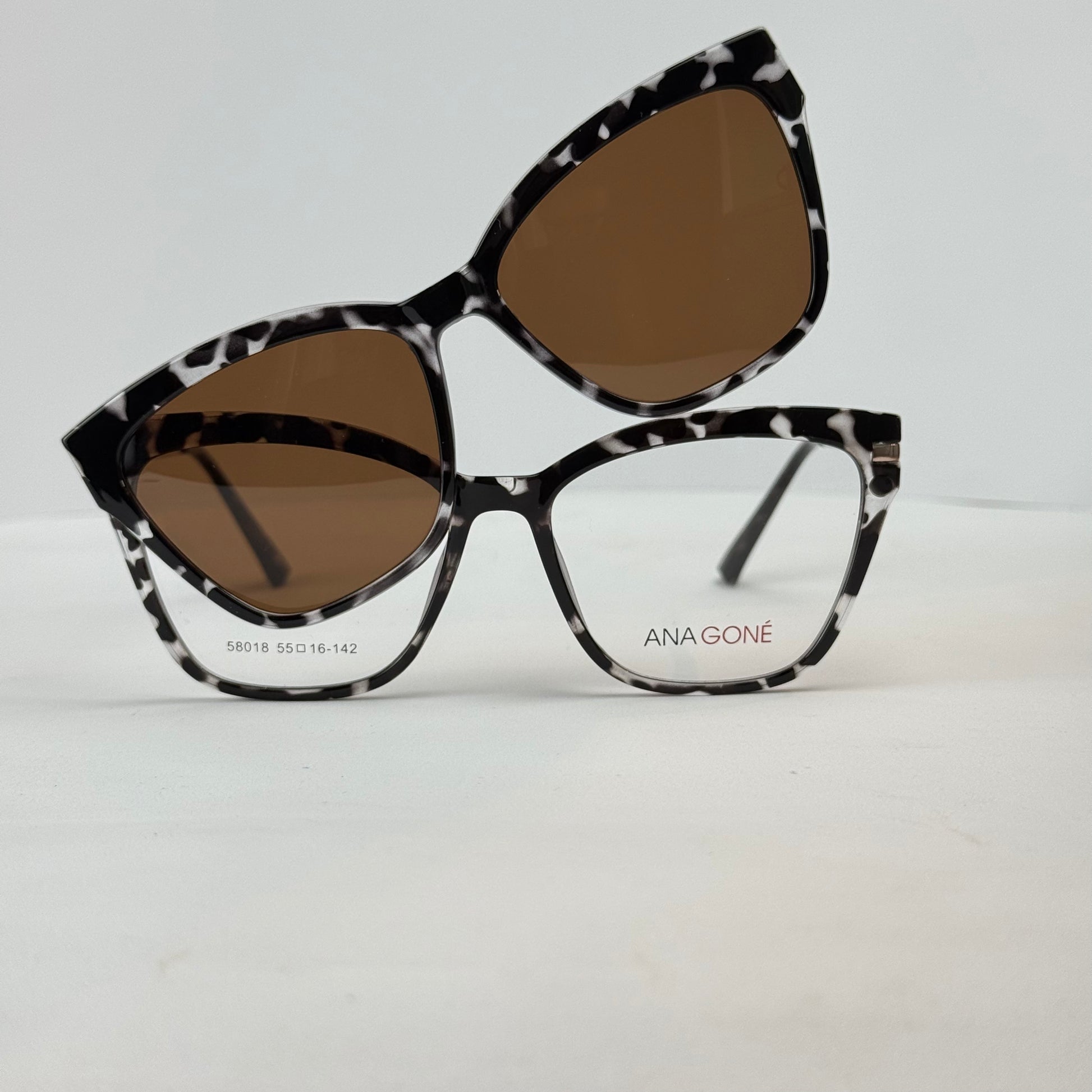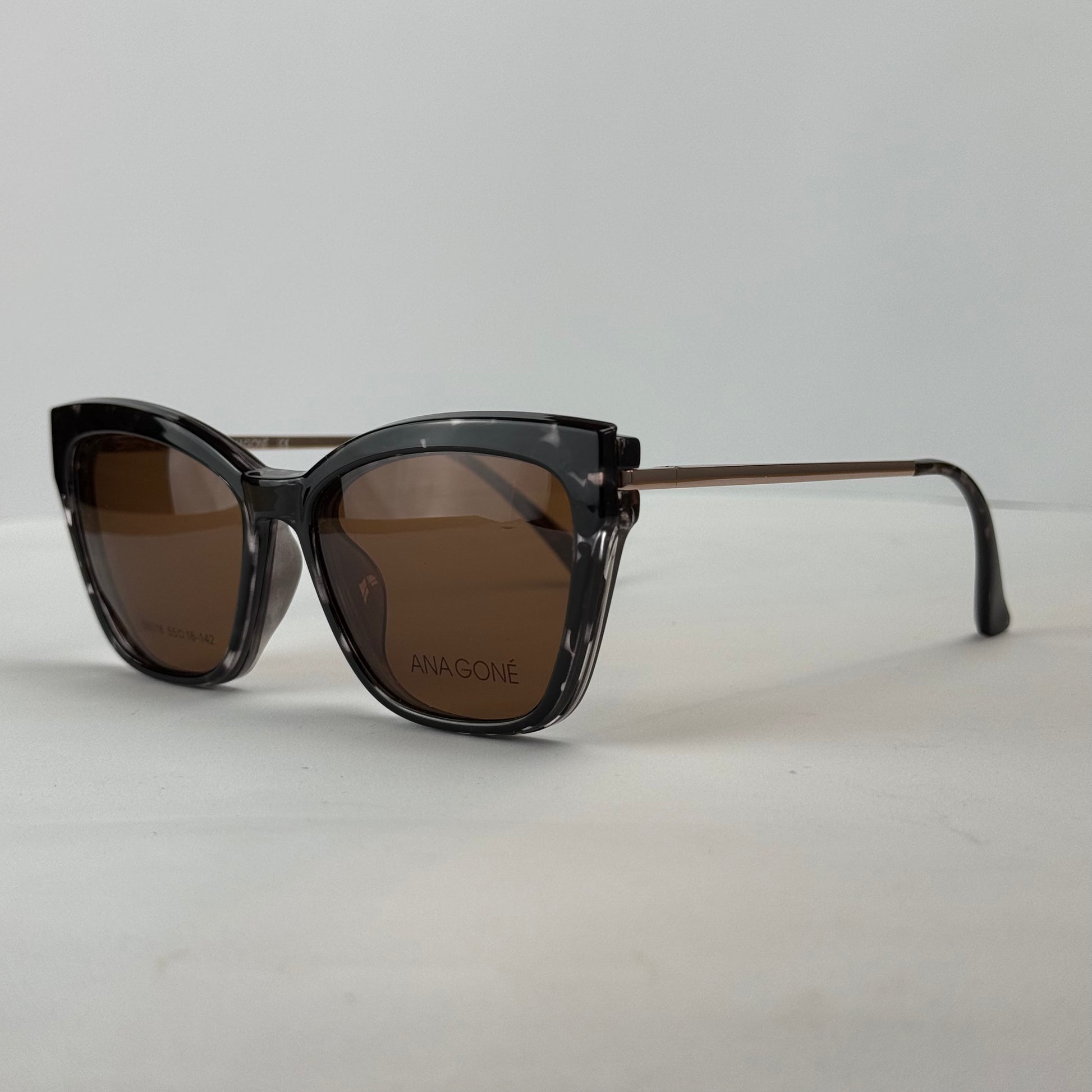 DESCRIPCIÓN:Su diseño cat-eye rectangular combina elegancia y estructura, ideal para rostros ovalados o redondos que buscan estilizar. El frente en pasta tortoise café oscuro con transparencia y las patillas doradas aportan calidez y sofisticación. El clip polarizado en tono café mantiene la armonía del conjunto, ofreciendo un look refinado y funciona.