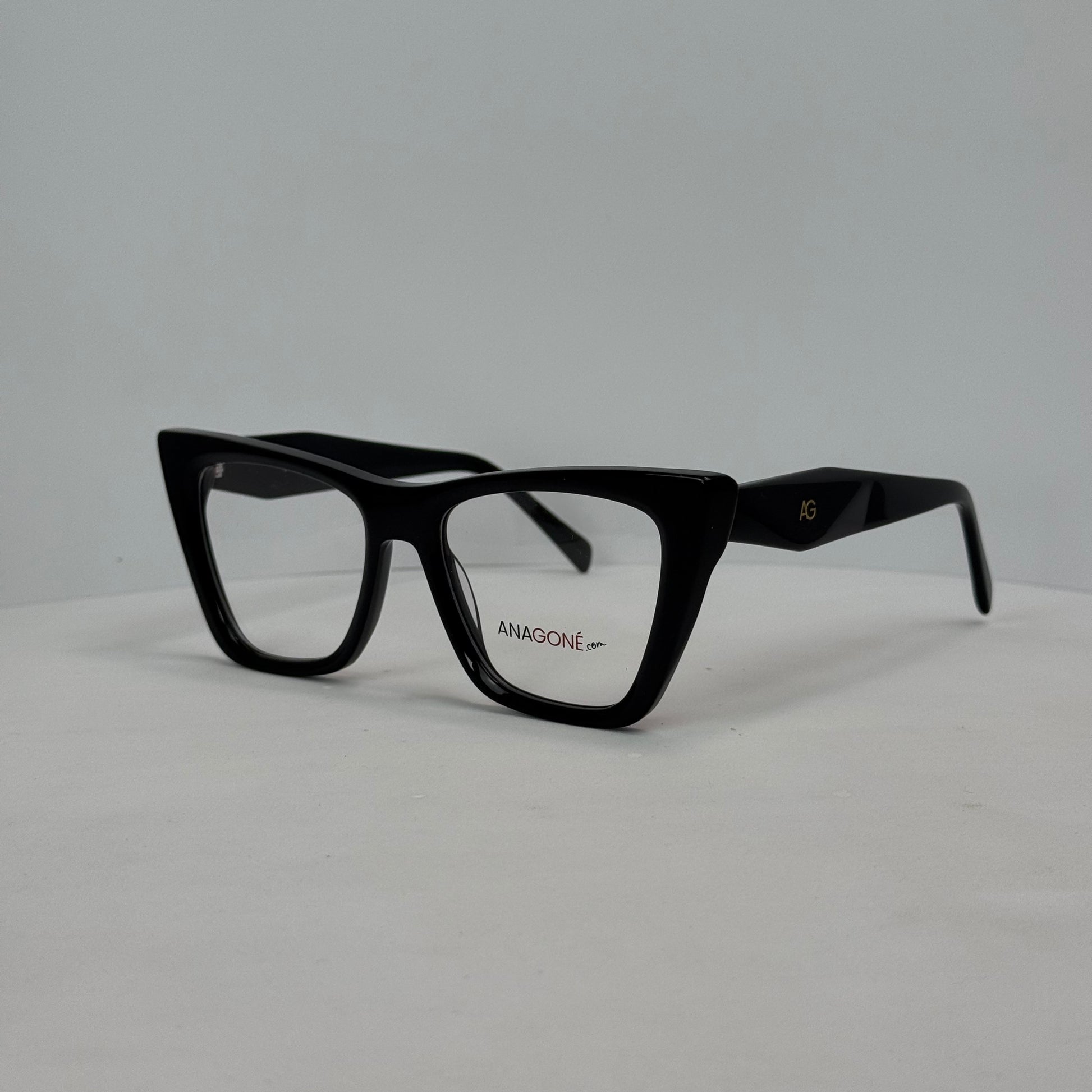 CARACTERÍSTICAS:Aro con frente y patillas de pasta gruesa, color negro sólido, brillante, diseño cat eye cuadrado angular.