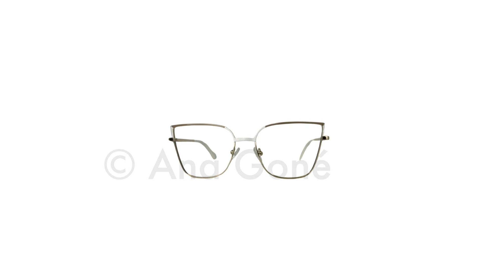 CARACTERÍSTICAS: Aro con frente y patillas en metal dorado. Frente con esmaltado en la parte superior blanco y beige, brillante, estilo cat eye cuadrado.